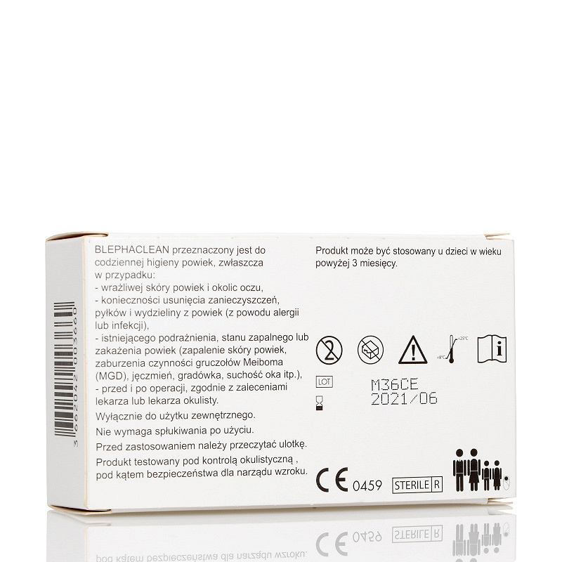 Oczyszczanie brzegów powiek: przed lustrem delikatnie pociągnąć dolną powiekę drugą ręką w dół, a następnie przetrzeć brzeg powieki chusteczką owiniętą wokół palca. Czynność powtórzyć wokół drugiego oka, używając nowej chusteczki. Nie wymaga spłukiwania po użyciu. Jeśli objawy nasilą się lub nie ulegną poprawie, należy skontaktować się z lekarzem lub farmaceutą.