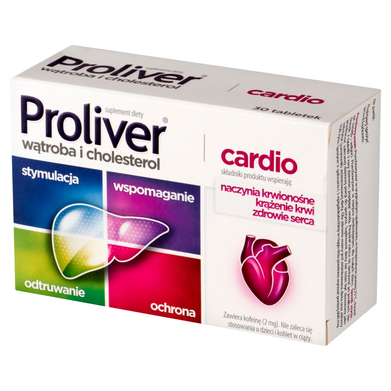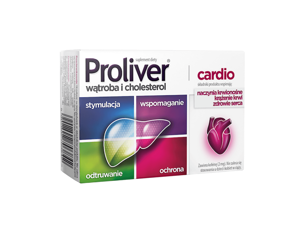 Składniki suplementu diety Proliver Cardio pomagają w prawidłowym funkcjonowaniu wątroby (cholina), wspomagają trawienie (cykoria), pomagają w utrzymaniu prawidłowego poziomu cholesterolu we krwi(wyciąg z zielonej herbaty), wspomagają prawidłowe funkcjonowanie serca (ostrokrzew paragwajski) oraz wspierają krążenie krwi (owoce głogu).Zalecane dzienne spożycie