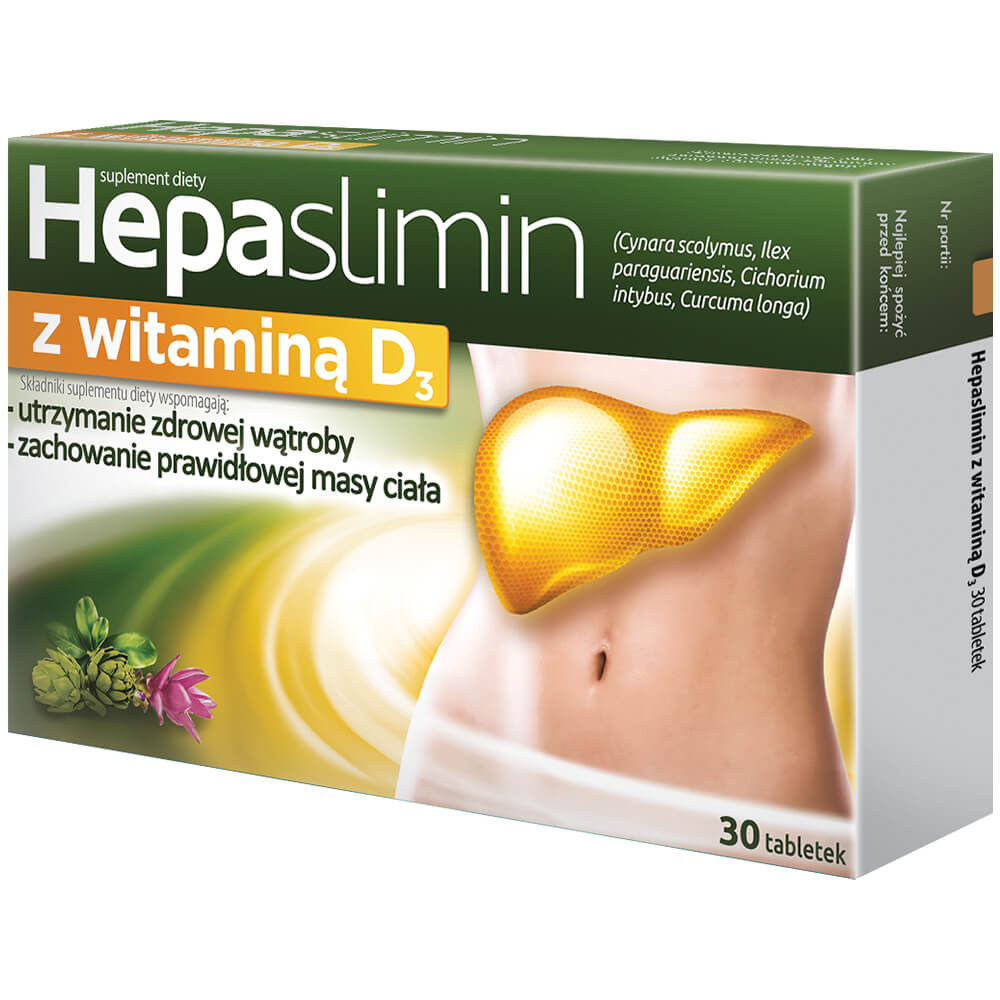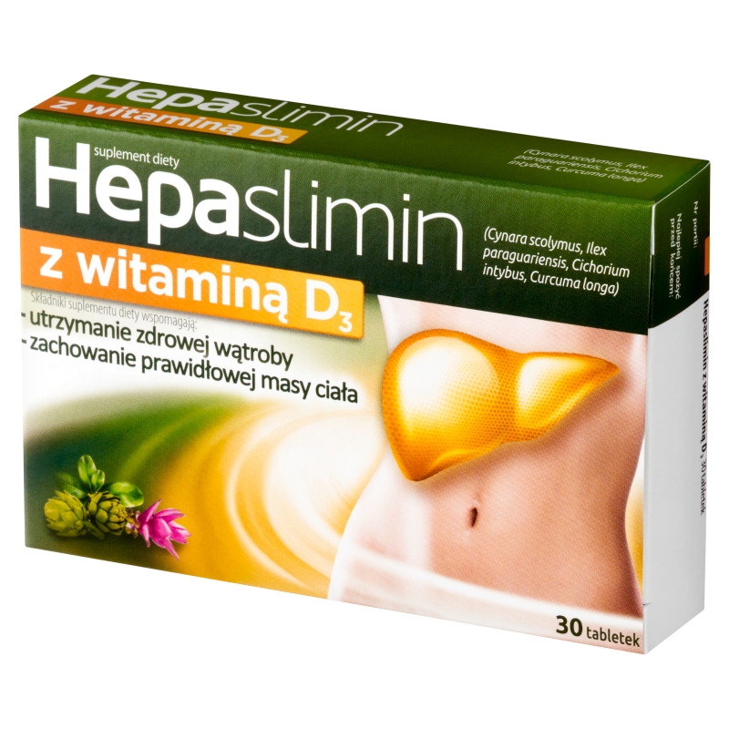 Hepaslimin z witaminą D3 to suplement diety zawierający w swoim składzie witaminę D3, która pomaga w prawidłowym funkcjonowaniu układu odpornościowego, zawiera również cholinę, która jest składnikiem naturalnie występującym w organizmie; wchodzi w skład fosfolipidów budujących błonę komórkową każdej żywej komórki.