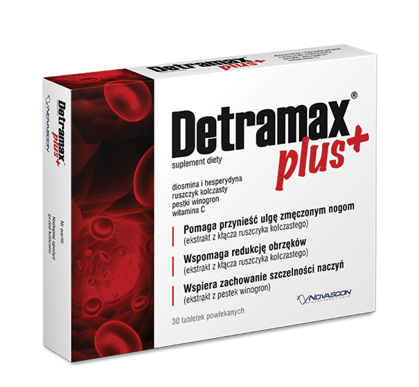 DETRAMAX Plus to suplement diety wspierający krążenie żylne i przynoszący ulgę zmęczonym nogom. Zawiera hydrolizowany kolagen, kwas hialuronowy, glukozaminę, chondroitynę, ekstrakt z ruszczyka kolczastego, ekstrakt z pestek winogron oraz witaminę C.